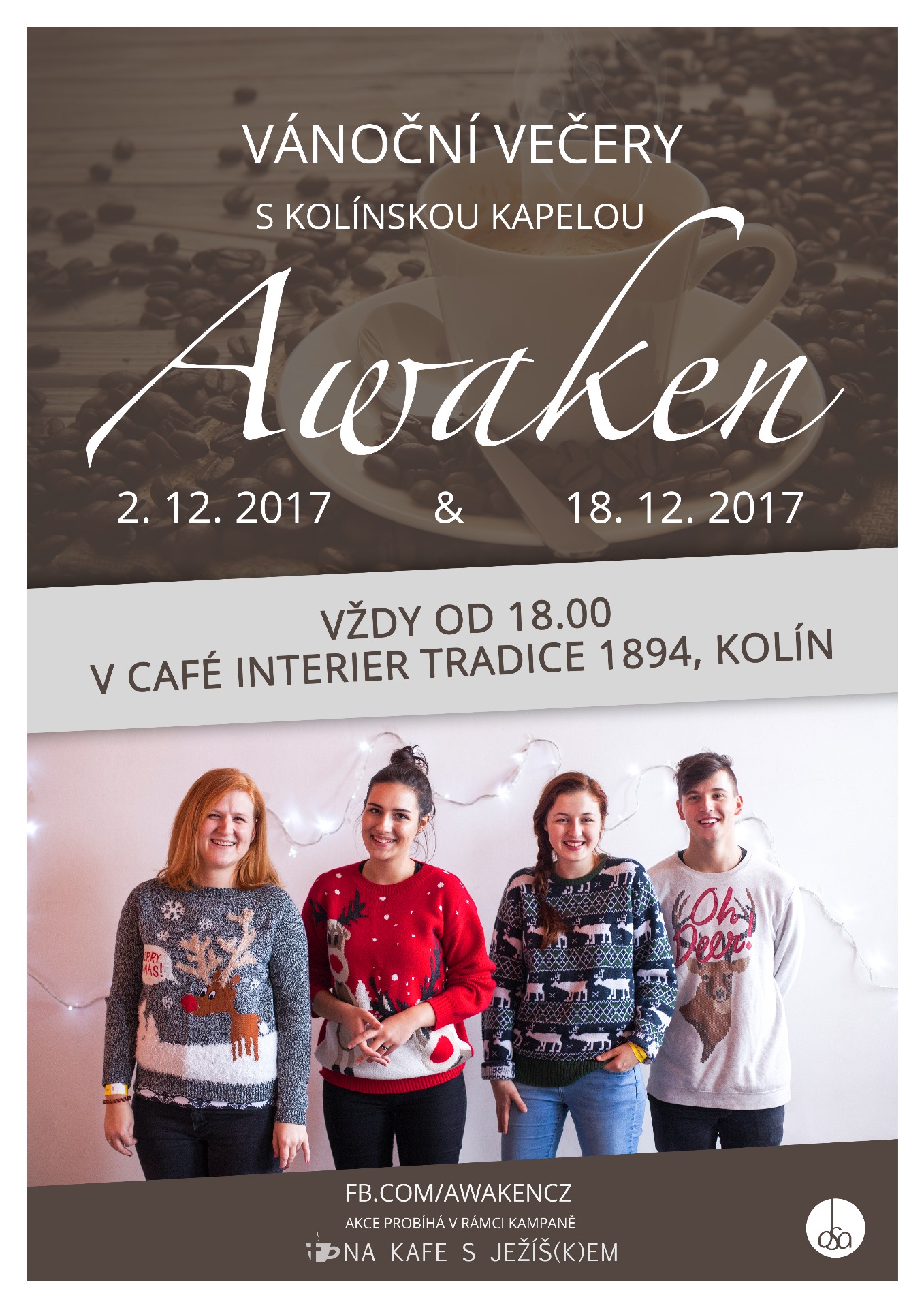 V rámci projektu: "Na kafe s Ježíškem" jsme se rozhodli i jako kapela Awaken lidem v Kolíně zpříjemnit adventní čas vánočními písněmi, které podtrhují vánoční atmosféru a přesto nezlehčují pravý význam vánoc. Jsme rádi za každého, koho můžeme potěšit.